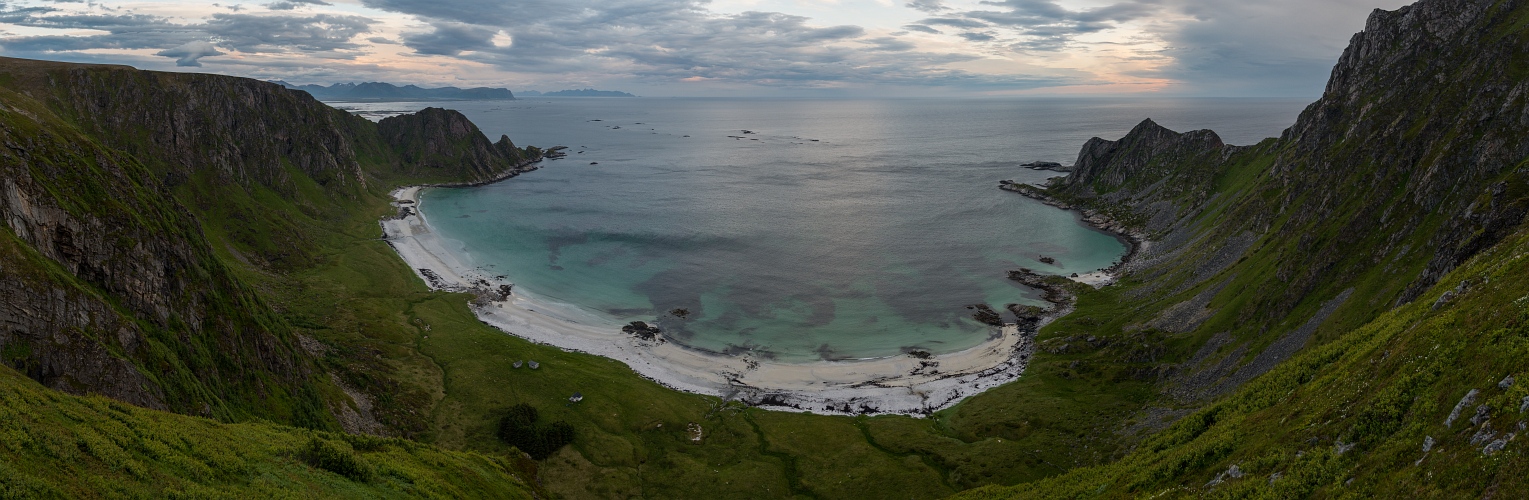 Nach dem Måtinden ging´s für mich noch runter zum (zumindest zu dieser Uhrzeit verlassenen) Traumstrand Høyvika, der auch ohne direkte Sonneneinstrahlung eine echte Augenweide ist. Mich erinnerte dieser Strand an Kvalvika auf den Lofoten. Gemeinsam haben diese nordischen Strände die durchaus karibische Anmutung, jedoch natürlich bei deutlich niedrigeren Wassertemperaturen ;-)