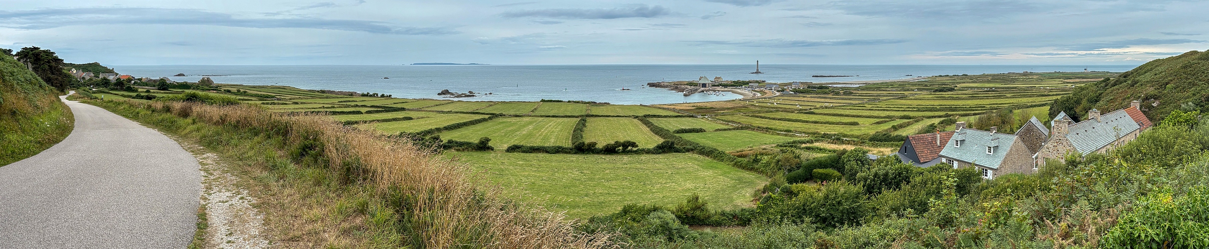 Bei einer kleinen Radtour an der Nordspitze des Cotentin bot sich dieser hübsche Blick hinunter zu den Weilern im Westen des Cap mit dem Leuchtturm, vorgelagerten Felsen und Alderney in der Ferne. Nichts spektakuläres, aber ein typischer Blick mit den zahlreichen Hecken, nach denen Hague benannt ist, und die den Panzern im 2. Weltkrieg manchmal überraschend stark im Weg standen.