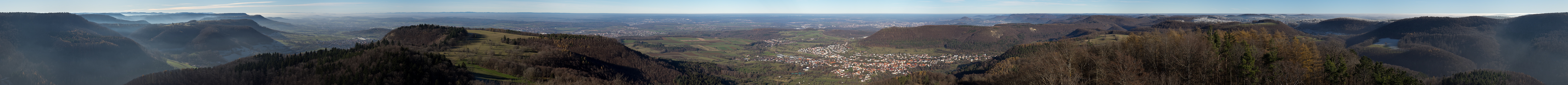 Dann kam der nächste Schreck: Der Roßbergturm war eingerüstet. Nach meiner Erfahrung bedeuten eingerüstete Aussichtstürme, dass sie geschlossen sind. Dem war aber nicht so. Man konnte problemlos hinauf. Die Aussichtsplattform ist normalerweise vorbildlich offen ohne Glas, Gitter und sonstige Störungen. Bei unserem Besuch störten mich allerdings ein paar Stangen des Gerüsts, das bis ganz nach oben reichte. Mit etwas höherer Brennweite konnte man zwischen den Stangen zwar hindurchfotografieren, man musste sich dabei aber verrenken. Der freie Ausblick war also behindert und unbequem. Als dann endlich mal keine Kinder mehr oben waren, fasste ich mir ein Herz und bin auf das Gerüst geklettert, um ungestört schauen und fotografieren zu können. Die Aufnahmen zu diesem Panorama entstanden also gut anderthalb Meter höher als es sonst vom Roßbergturm möglich ist. Sofort taten es mir ein paar andere Besucher gleich, sofern sie ohne Ehefrauen unterwegs waren. Meine Aufnahmen entstanden einhändig. Es erschien mir doch ratsam, mich mit der anderen Hand am Geländer festzuhalten.