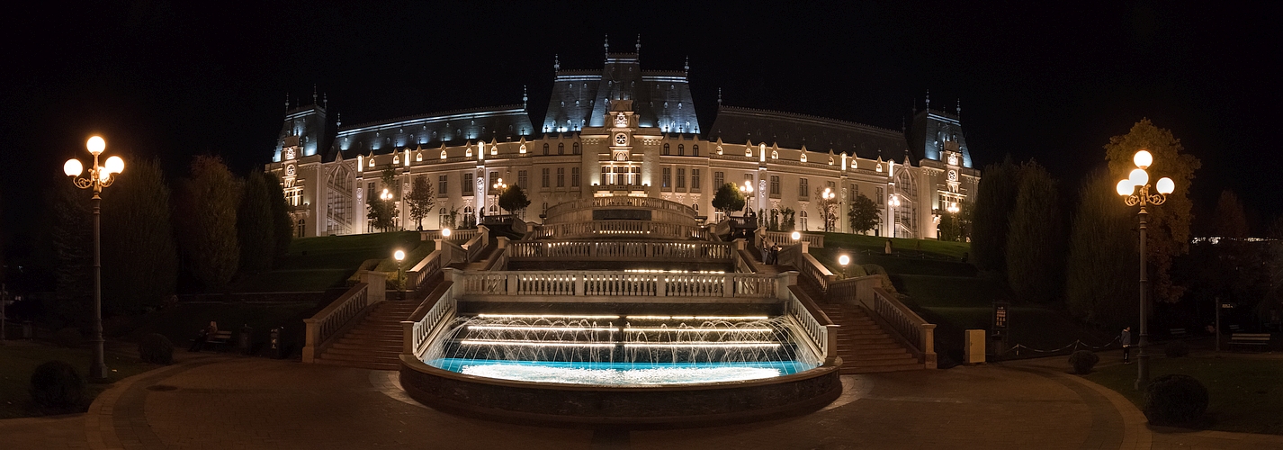 Eine Nachtaufnahme vom imposanten Wahrzeichen von Iasi, dem Kulturpalast (Palatul Culturii). Zu sehen ist der Südflügel des Gebäudes, aufgenommen vom schön angelegten und gut besuchten öffentlichen Palastgarten (Gradina Publica Palas).