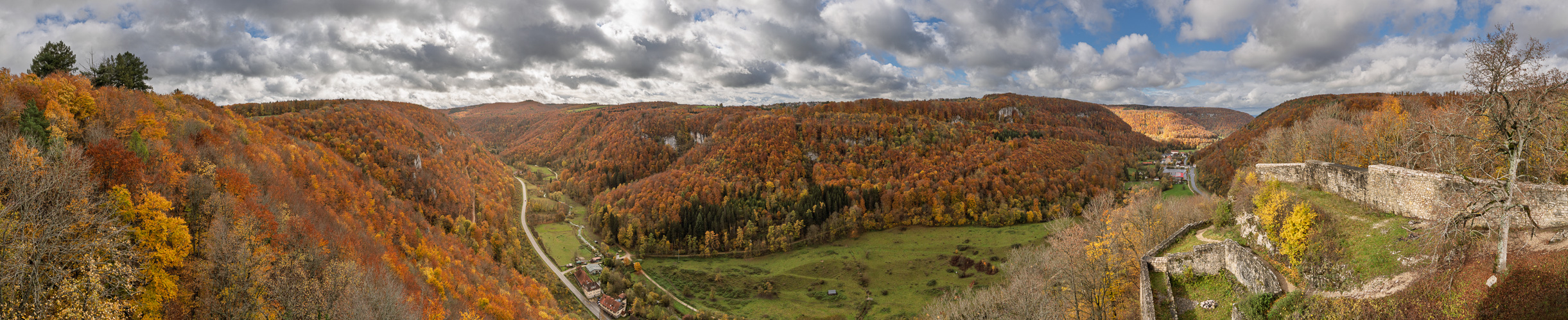 Ein schöner kleiner Steig führte uns hier her, hoch über dem Tal. Der Ausblick auf die bunten Herbstwälder überwältigte uns. Rasch wechselndes Licht ließ die Natur aufleuchten.