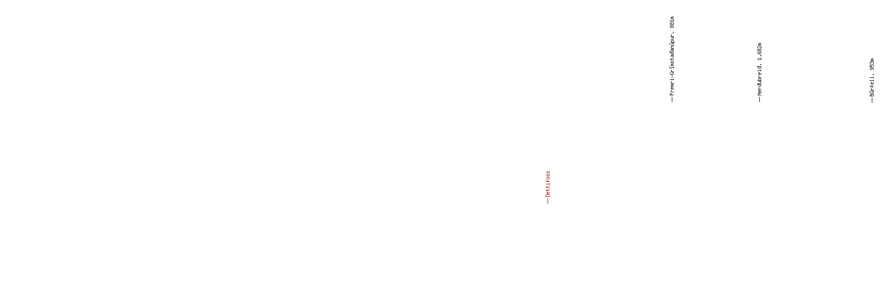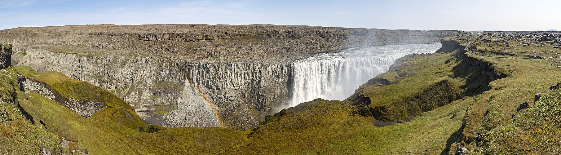 Gespeist wird er vom Jökulsá á Fjöllum, dem Gletscherfluss aus den Bergen, im Norden Islands und liegt knapp 30 Kilometer vor dessen Mündung in den Arktischen Ozean. Der Fluss entwässert den Nordteil des riesigen Gletschers Vatnajökull, immerhin der größte Gletscher Europas. Über eine Breite von etwa 100 Metern ergießen sich die grau-braunen Wassermassen über 44 Meter in die Tiefe der Schlucht Jökulsárgljúfur.