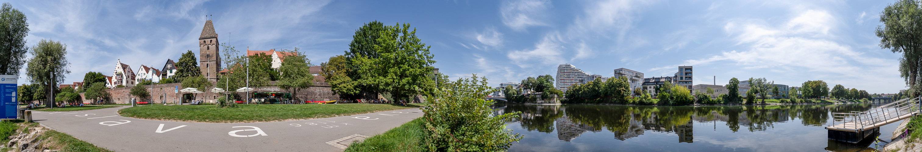 Altstadt und Neustadt Baden-Württemberg und Bayern Freizeitflair und Arbeitsstätte Hier, wo die Donau Grenzfluss ist, präsentieren sich beide Ulms auf ihre Weise. Die Schrift auf dem Asphalt motiviert den Donau-Radler und zeigt ihm auf gut einem Kilometer in großen Lettern ausgewählte Städte zwischen Donaueschingen und dem Schwarzen Meer. 14 HF-Aufnahmen, 13 mm (20 mm KB, beschnitten auf ca. 35 mm), f/9, 1/400 s, ISO 100. |