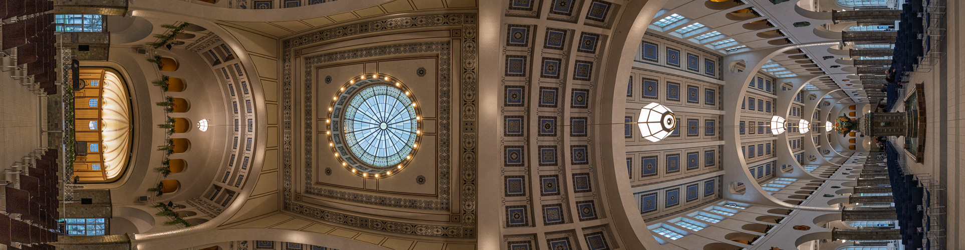 Während sich äußerlich die Formensprache des Neoklassizismus zeigt, dominieren im inneren die Elemente des Jugendstils. Eine Mischung aus Kunst- und Naturlicht tauchte den Baukörper zur beginnenden Blauen Stunde in interessantes Licht.