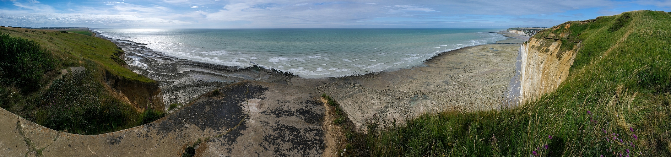 Fortsetzung der Wanderung von #34205 entlang der Kanalküste. Kurz vor Criel Plage erhebt sich der Mont Jolibois, von dem man nochmals einen Tief- und Weitblick genießen konnte. Ein Betonplateau machte das Panoramisieren schwierig. Rückblickend verstehe ich nicht, warum ich näher an den Rand gegangen bin. Vielleicht sah das nicht 100 % stabil und vertrauenserweckend aus.