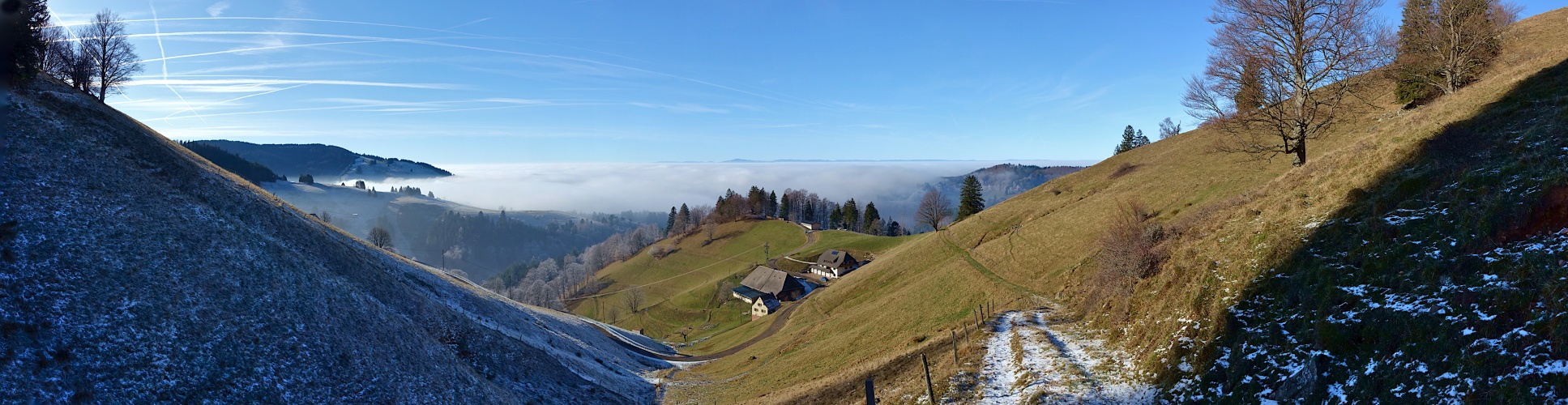 Wieder mal ein Panorama vom Sittnerberg im obersten Münstertal. Steile Wiesenhänge, herrliche Nah- und Fernsichten, und vor allem Ruhe und Einsamkeit locken mich immer wieder hier hinauf. Drei Begegnungen am 2. Weihnachtsfeiertag waren erträglich. Der höchste Punkt mit 1100 m reichte heute locker um aus dem kalten Nebelgrau in sonnig warme Lüfte zu gelangen.