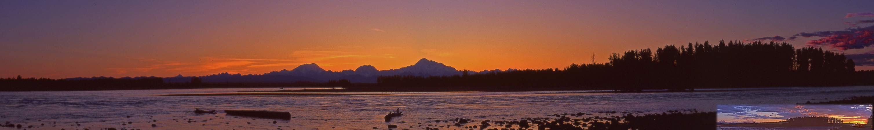 Um 4 h ging die Sonne dann überm Fluss schon wieder auf, siehe Inset. Der Denali badete sich da wegen der gigantischen Höhe von 6.190 m bereits lange vorher im warmen Licht.