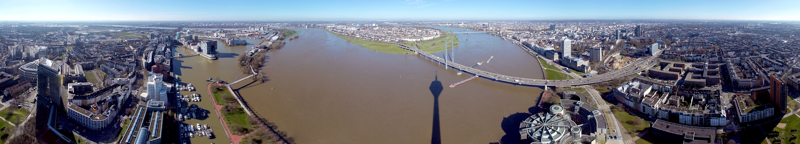 Der Rheinturm in Düsseldorf begeistert nicht nur durch seine Fernsicht, sondern auch durch den Tiefblick auf Rhein, Medienhafen und Landtag. Während das zuerst hier eingestellte Bild im Freien auf der obersten Antennenplattform in 194m Höhe aufgenommen wurde, befinden wir uns hier auf der 170m hohen Besucherplattform. Die Scheiben sind schräg nach unten geneigt, so dass auch der senkrechte Blick nach unten frei ist.