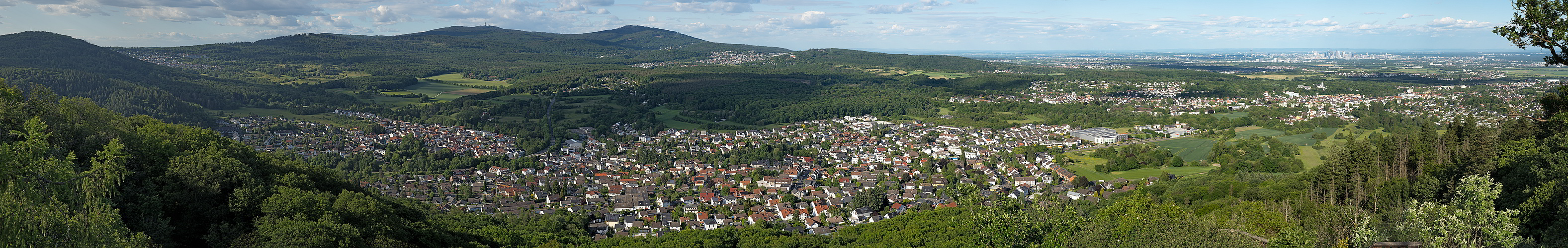 Der Große Mannstein ist ein Felsen am Staufen (451 m) im Taunus. Diesen Aussichtspunkt lernte ich erst durch Martins Panorama Nr. 10942 kennen. Diese natürliche Aussichtstelle bietet einen attraktive Weit- und Tieflblicke nach Osten. Mir ist völlig unverständlich, weshalb ich über 12 Jahre brauchte, mir ein eigenes Bild von dort zu machen, obwohl ich jedes Jahr mehrfach im Taunus bin. Auch sonst scheint niemand dort gewesen zu sein. Ich zeige weniger Zoom als Martin, damit Kelkheim und der Feldberg auch ins Bild passen. Martin hatte damals die bessere Fernsicht.