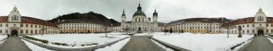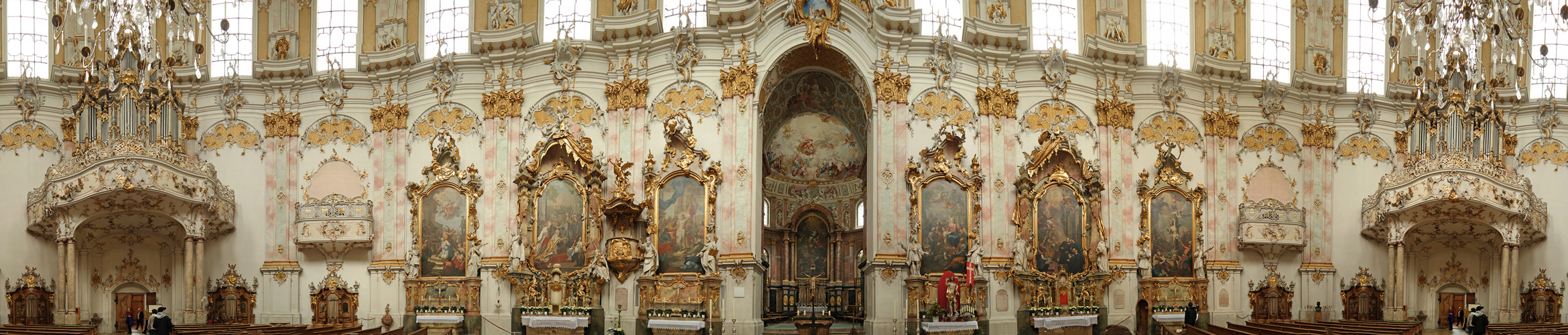 Sehr schwierig zu panoramisieren, immer wieder laufen Menschen durch die Kirche und ich musste Weitwinkel mit Hochformat einsetzen und dabei die Kamera nach oben halten. Leider kommt die Rundung der Kirche hier kaum zur Geltung. Dann ergab sich die Frage, wo ich den Schnittpunkt setze. Irgendwo in der Seite hätte die barocke Symmetrie zerstört, Altar und Orgen zu zerschneiden wäre ein Jammer gewesen. Also habe ich die Orgel doppelt genommen. Hören wir die Musik also in Stereo ;-)