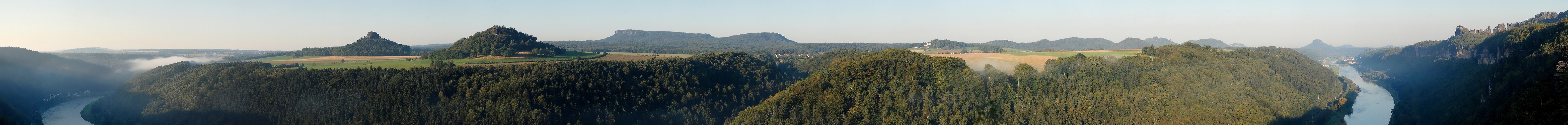 Das Elbsandsteingebirge besteht auf deutscher Seite - grob gesagt - aus zwei Hälften: Der Hinteren Sächsischen Schweiz, die hier im Rücken des Fotografen liegt, mit fast durchgehender Bewaldung, starker Zerklüftung und kleinteiligen Felsformationen.