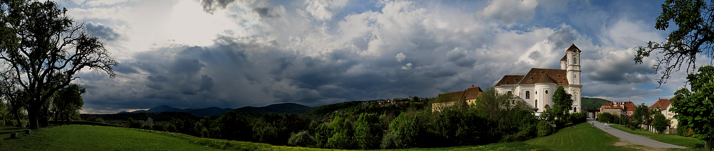 Dieses Panorama entstand bei der schönen Kirche am Weizberg, zwischen Weiz und Landscha gelegen, bei spätnachmittäglicher Wetterstimmung.