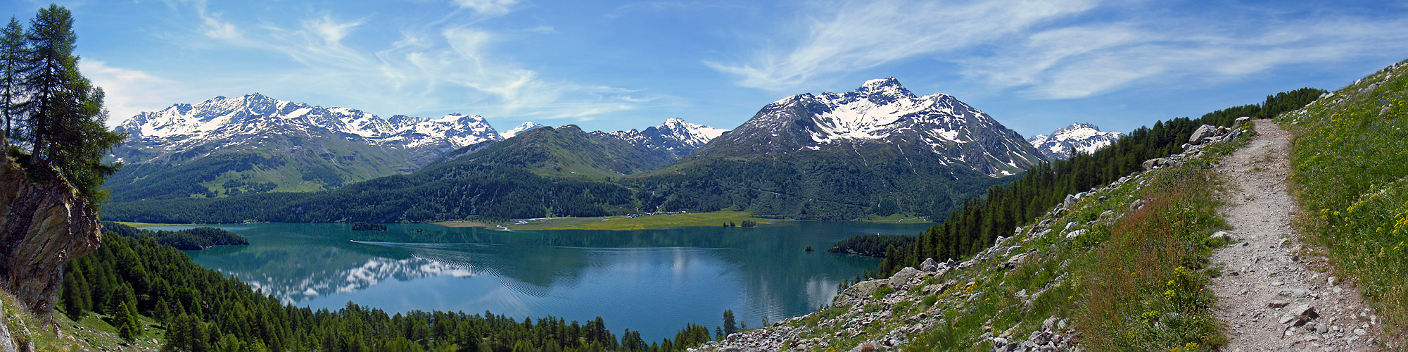 Vor just einem Jahr genossen wir auf der Via d'Engiadina über dem Silsersee diesen prachtvollen Föhnhimmel über dem Piz Corvatsch und da la Margna . Zudem durchpflügt eines der wenigen Motorboote der höchsten Schifffahrtslinie Europas den fast spiegelblanken 5 km langen Alpensee, der auf knapp 1800m Höhe liegt... Freihandpano aus 5 HF-Aufnahmen mit f/7, 1/220s, 100 ISO, 28mm (KB) |