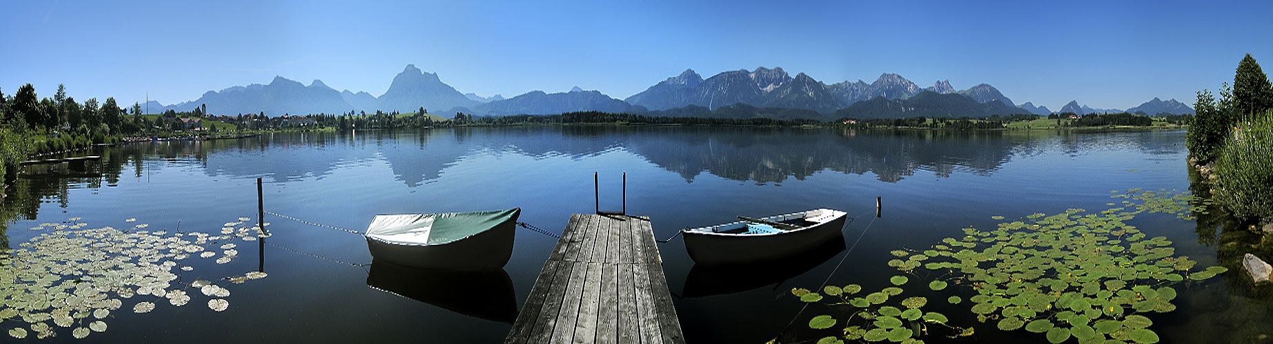 ... könnte man meinen. Vielmehr war es aber so, dass hinter mir an einem Haus gebaut wurde und schon jede Menge Badegäste, Walking-Gruppen der nahegelegen Kurklinik Enzensberg, Surf-Schüler, Fahrradfahrer oder einfach nur Spaziergänger, so wie meine Frau und ich, unterwegs waren. Auf dem Weg zum Baumarkt nach Füssen hatten wir beschlossen, die knapp 7 km große Runde um den See zu drehen.