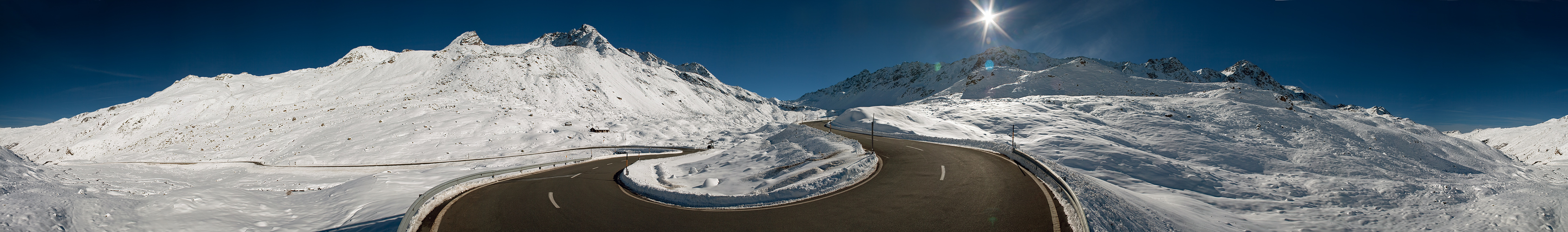 Bei so einigen Panos stört es mich eher, wenn Strassen allzu prominent durchs Bild führen - meist ein nicht optimal gewählter Standpunkt. Hier aber ist das anders. Die schwungvolle Kurve (zumindest erinnere ich mich, sie im Sommer auch schon mal auf dieser wunderbaren Paßstrasse schwungvoll genommen zu haben) ist Grundlage für einen sehr spannenden Bildaufbau. Mit dem leuchtenden Neuschnee eine tolle Kombination. Nur die bunten Reflexe könntest Du vielleicht noch angehen. VG Martin