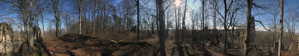 Am besten zu betrachten sind die stark einsturzgefährdeten Gemäuer im Winter, da dann nicht zu viel Laub die Sicht versperrt. Ansonsten kann man sprichwörtlich vor lauter Bäumen die Burg nicht mehr sehen. Näheres zur Geschichte siehe Wikipedia. Das Bild deckt ca. 340 Grad ab, für die Aufnahmen habe ich mich an einen Baum gelehnt und gedreht, insgesamt waren es 16 HF Aufnahmen. |