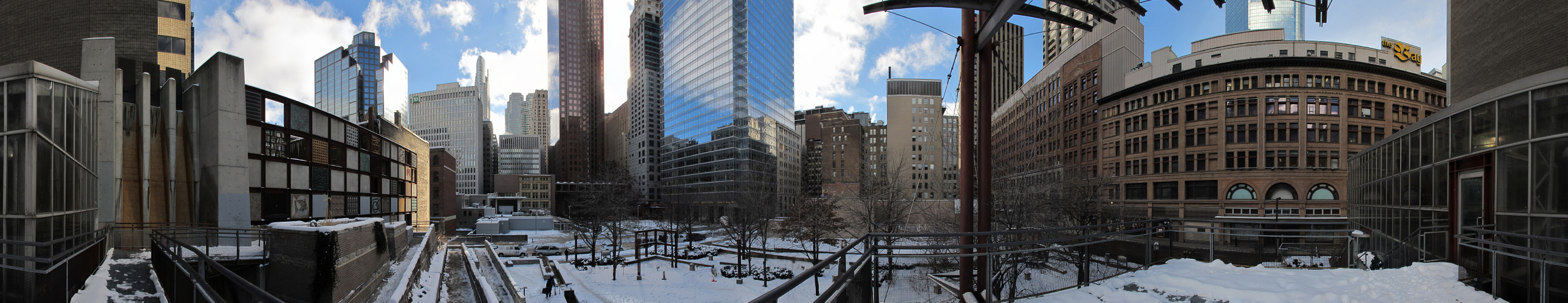 Ein kleiner City Park, der auf kleinstem Raum erstaunlich grosse Vielfalt bietet, inklusive einem Mini-Regenwald im Gewaechshaus. Und natuerlich eine interessante Perspektive fuer ein 360Grad Pano. Im Januar war's recht kalt, dh. hoechstens ca minus 10Grad Celsius. Weil fast alle der ersichtlichen Gebauede unterirdisch miteinander verbunden sind, wagten sich da auch nur wenige Leute nach aussen... (wahrscheinlich meist Raucher, denn die Panoramaphotographen sind ja nicht allzu zahlreich). Mittlerweile ist auch her der meiste Regen wieder weggeschmolzen und der Platz wird wieder rege besucht. Herzlichen Dank an Hans-Juergen, der ein aehnliches aelteres Pano von mir auf Panoramio gesehen hatte und mich ermutigte, es hier zu zeigen. Vielen Aufnahmen im Hochformat mit der Canon G11. Stativ & gebasteltes Nodalpunktadapter. Gestitcht mit PTGui.