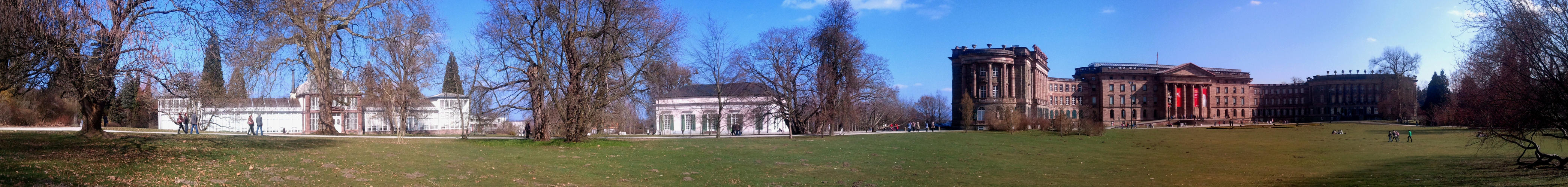 Blick vom Schlosspark unterhalb des Fontaineteich zum Schloss Wilhelmshöhe und dem Großen Gewächshaus.