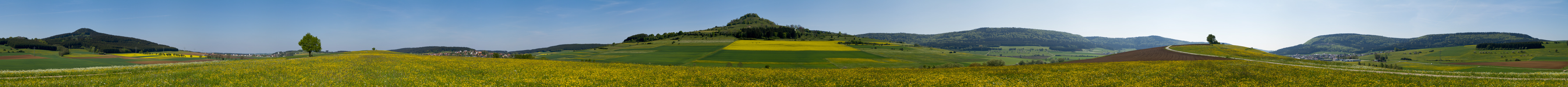 Ein nahezu 360°-Panorama von der Baar beim Hohenkarpfen im Frühling. Wie bei allen solchen Panoramen gibt es bei Sonnenschein einen Bereich mit Gegenlicht. Aufgenommen mit EOS 7D, Tamron 17-50 mm/2,8 bei 48mm, Blende 9.