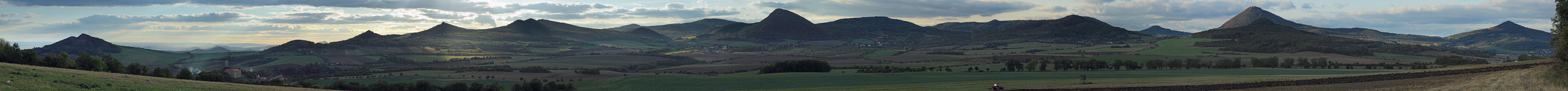 Für dieses Panoram habe ich eine Serie von 18 RAW-Aufnahmen, die ich mit einer EOS 600D und dem Sigma-Objektiv 18-125 HSM OS @ 73mm, 1/200Sek., Blende 9 und ISO100 gemacht hatte, verwendet. Obwohl ich noch andere Serien, auch mit Belichtungsreihen gemacht hatte, habe ich diese Serie ausgewählt, weil hier die Aufnahmen trotz der stark wechselnden Lichtverhältnisse am schönsten waren, vor allem die bei den beiden Milleschauern. Die starken Lichtgegensätze, vor allem die gegen die schon ziemlich niedrig stehende Sonne, versuchte ich zu meistern, indem ich die RAWs mit abgestufeten Helligkeiten entwickelte und die daraus gestitchten identischen Panoramen in Photoshop in der Art des Enfusings übereinanderlegte. Der Breitenwinkel des Panoramas ist 184°.